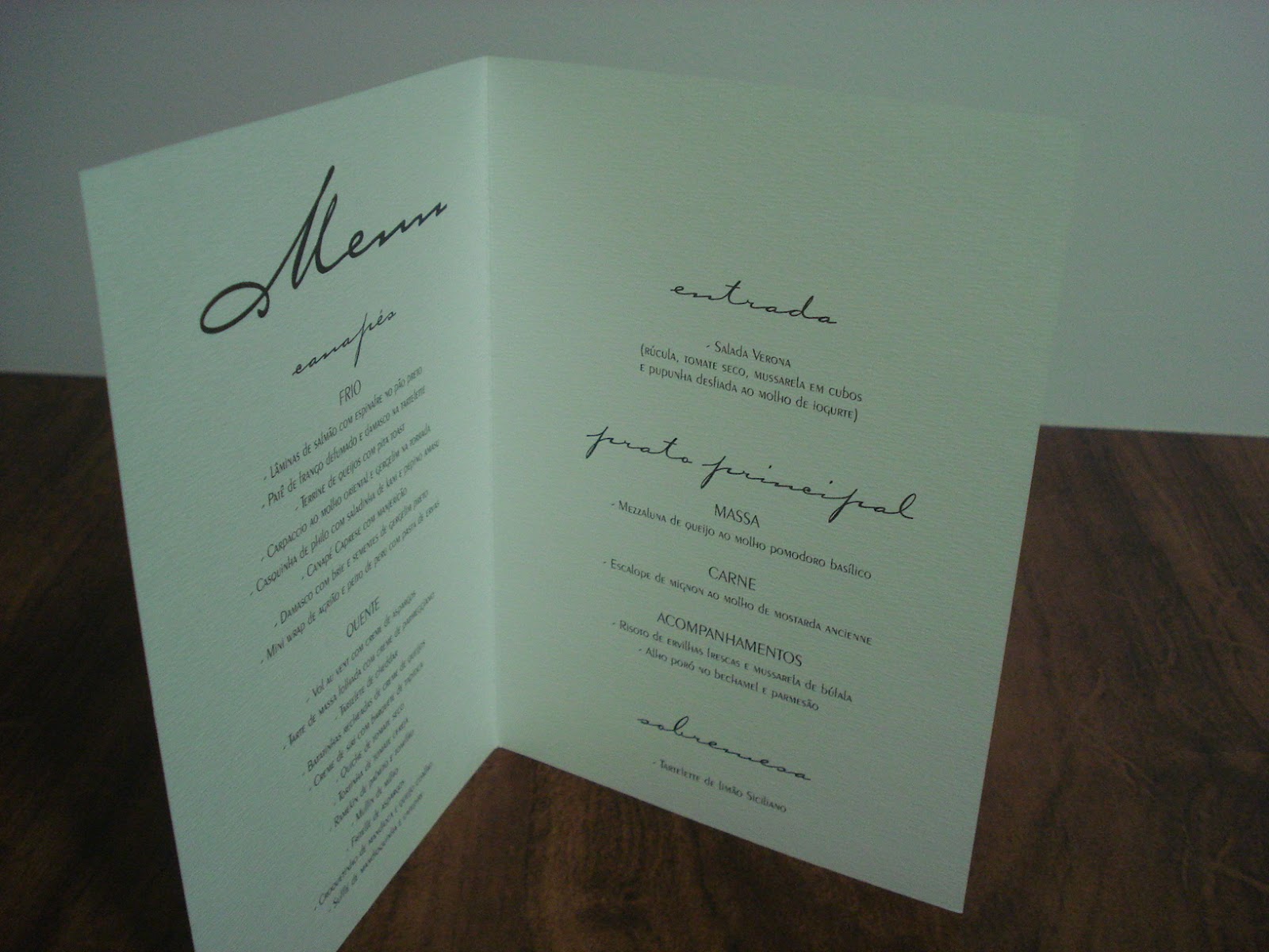 Como vocês já devem ter visto na relação dos nosso fornecedores, a SCards foi a responsável pela criação do monograma e por toda a papelaria do nosso casamento. Além dos convites, também optamos por porta-guardanapos, garrafinhas de água e menu personalizados. Por enquanto, mostro também o menu, disposto nas mesas dos convidados.